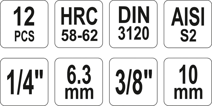 Dĺžka bitov 37 a 48 mm, určené pre 1/4" a 3/8" račne. V sade je kovový držiak bitov a samotné bity T8-T55. Splňuje normu DIN 3120 pre vysoko-zaťažovateľné nástavce.